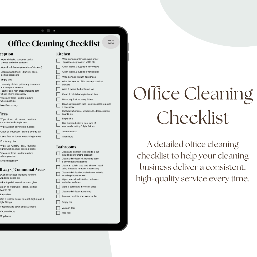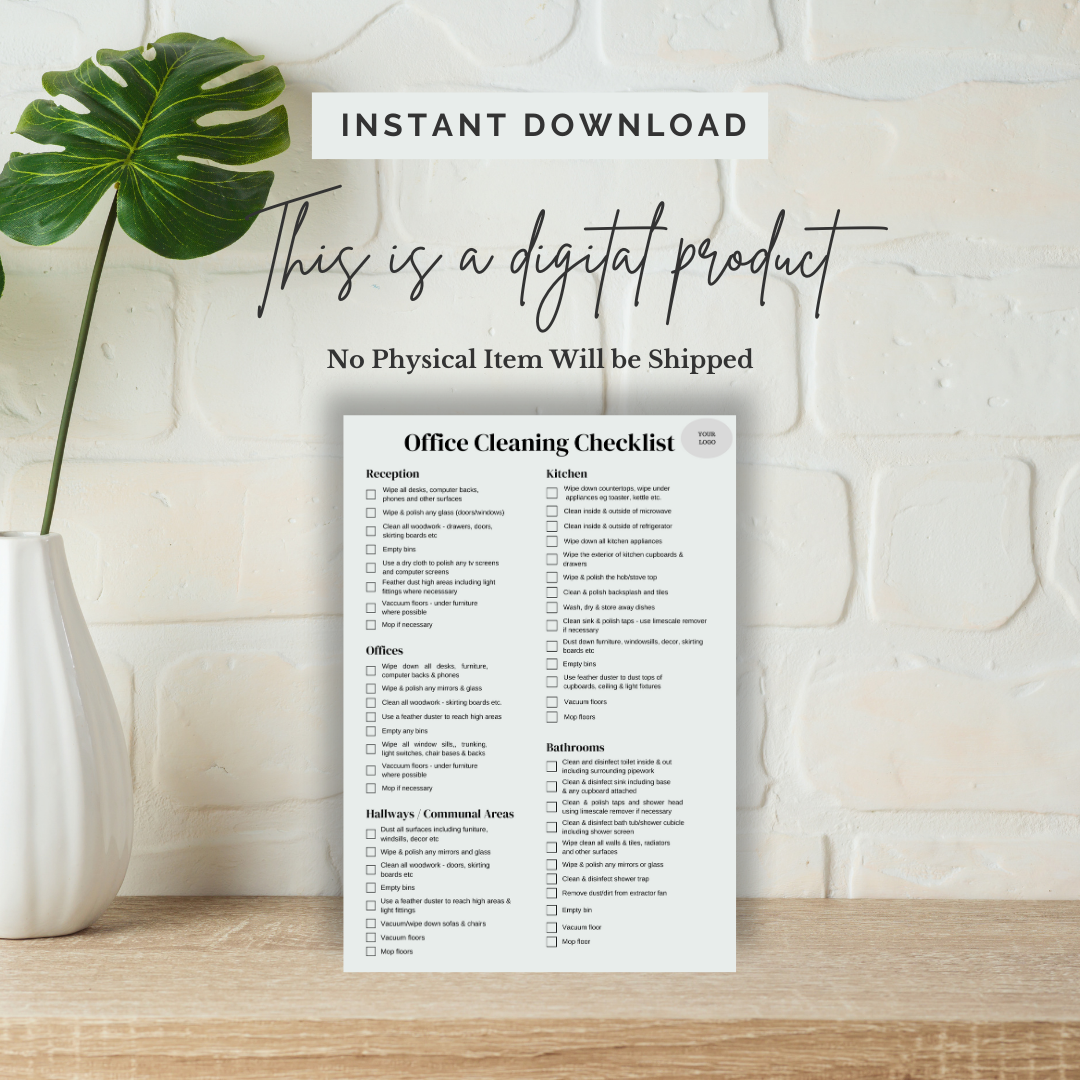Our Editable Office Cleaning Checklist is a must-have tool for cleaning businesses looking to provide consistent, high-quality service. Customisable to suit different office spaces & branding, this checklist ensures that every cleaning task is completed to the highest standard. Streamline your operations, stay organised, and deliver top-notch results for your clients every time. Download now and elevate your cleaning business with this easy-to-use, editable template!